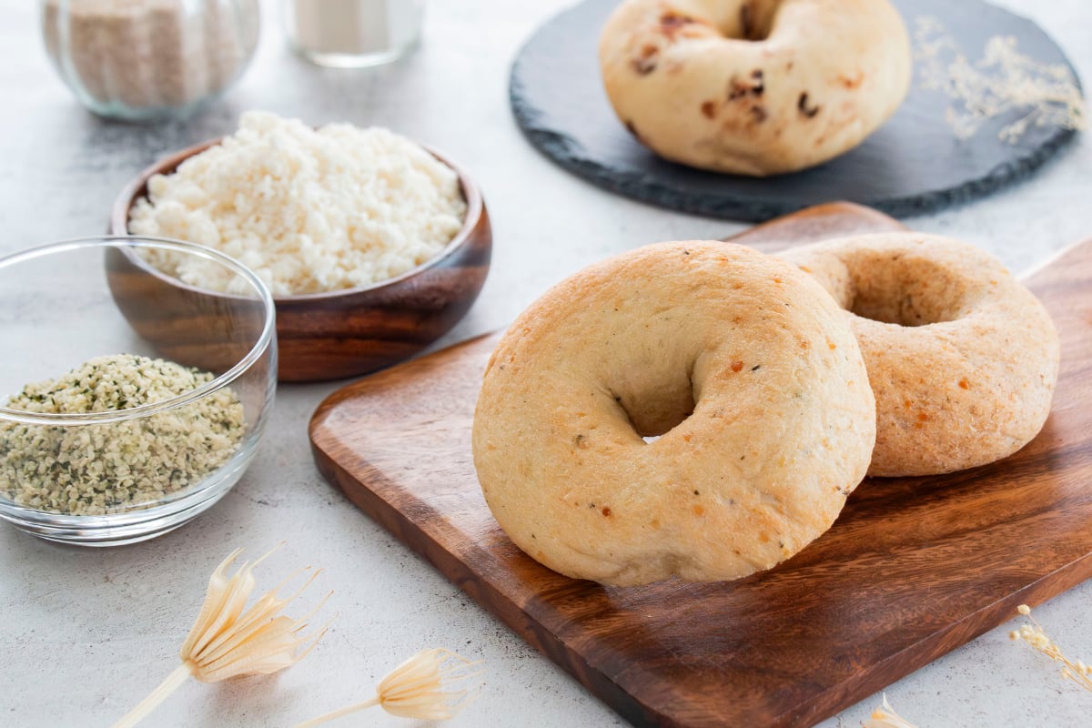 【MEGURU ベーグル Lite】 プレーン Liteは、たんぱく質が10g摂れる全粒粉を使ったベーグルです。国産小麦の「ゆめちから」を使い風味豊かな仕上がりになっています。 プロテインを足すのではなく、食材の組み合わせの工夫で高たんぱくなベーグルを目指しました。 おからとヘンプシードは実はスーパーフードの仲間です。これはを採用することによって従来のベーグルでは摂りにくかった栄養素と低脂質を実現しながら、ベーグルとしてのおいしさも追及できました。 おからは京都南禅寺豆腐の老舗である服部食品から提供いただいています。全国各地さまざまな種類の大豆の中から 選んだのは「北海道ユキホマレ」。(※仕入れ状況等や時期により予告なく変わる場合あり。)大豆本来の甘味がベーグルにも活きています。 ■ 原材料 小麦粉(国内製造)、全粒粉、おから、甜菜糖、ヘンプシード、麦芽シロップ、酵母、食 塩、シナモンパウダー、(一部に小麦・大豆を含む) ■アレルゲン 小麦、大豆 ■ 栄養成分表示 (推定値) ※1個あたり ・エネルギー 294kcal ・脂質 3.6g ・タンパク質 10.3g ・炭水化物 56.8g ・食塩相当量 1.1g ■ 賞味期限 製造日より冷凍保存で3ヶ月 ■ 保存方法 常温:直射日光を避け冷暗所で保存してください。(解凍後は2日以内にお召し上がりください) 冷凍:冷凍庫に保管入れていただくと約2ヶ月間保存いただけます。(裏面の賞味期限を参照ください) ■ おすすめの召し上がり方 家でストックしていただいいて好きなタイミングで朝食や昼食にご利用いただけます。冷凍庫から取り出した際は600wのレンジで1分加熱し、横にスライスしたベーグルを2~3分を焼いて召し上がるのがオススメの食べ方です。